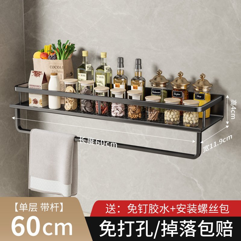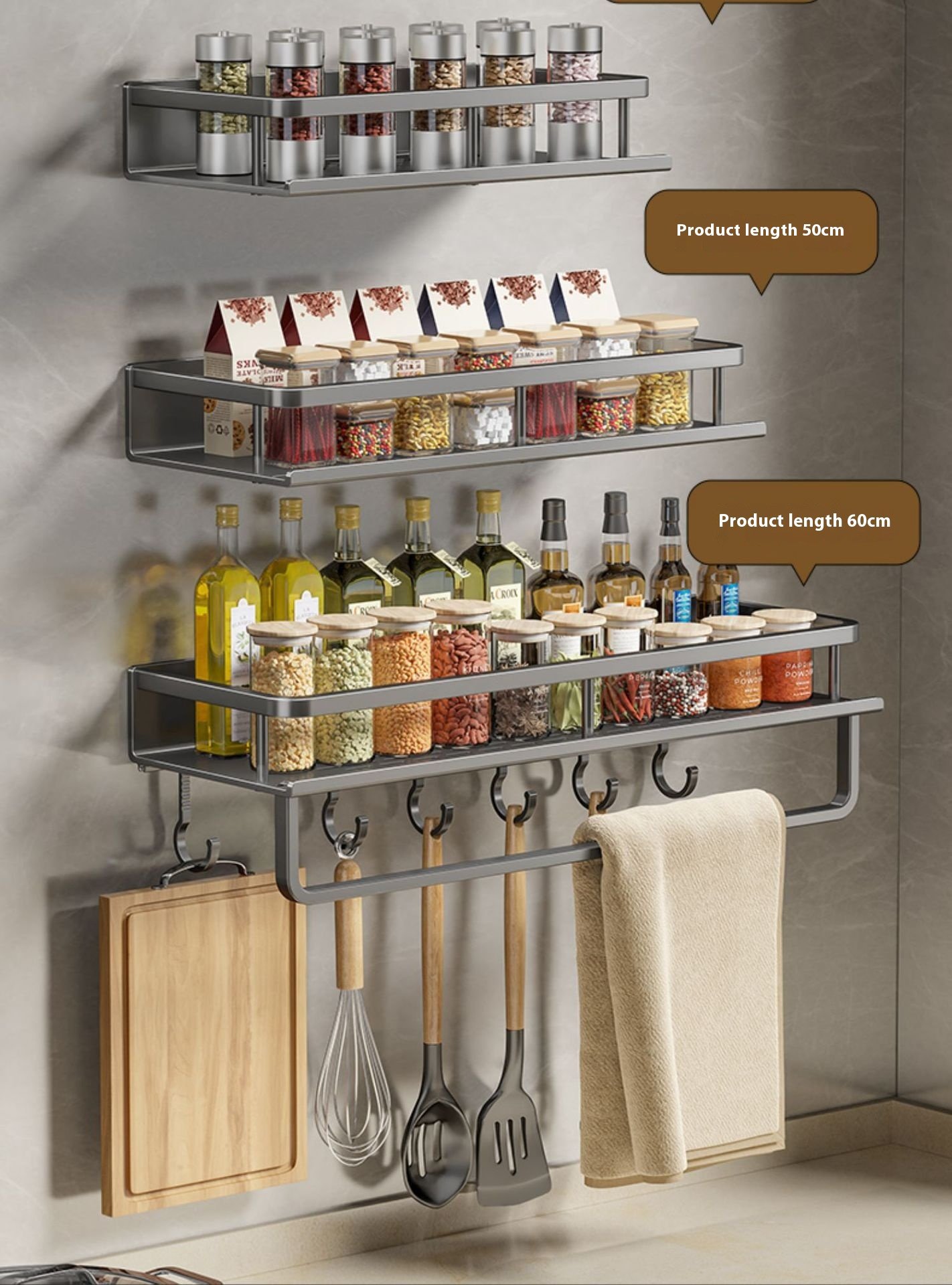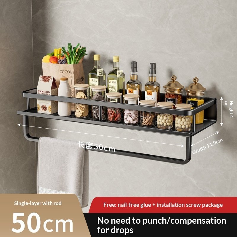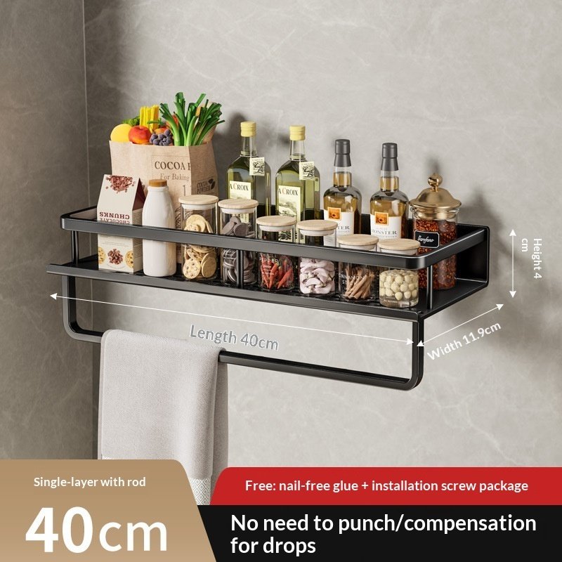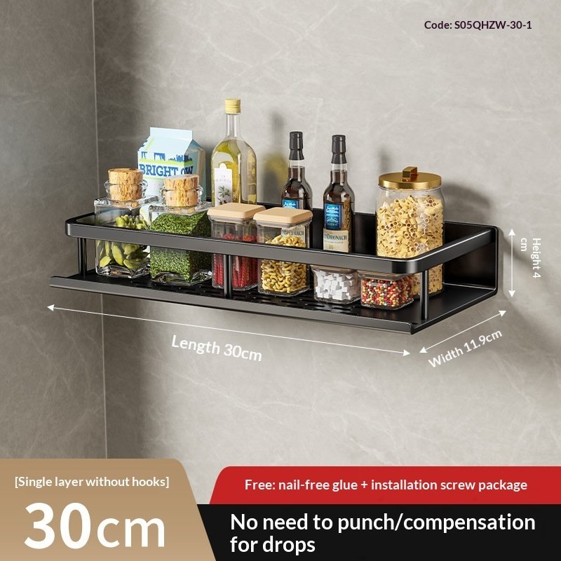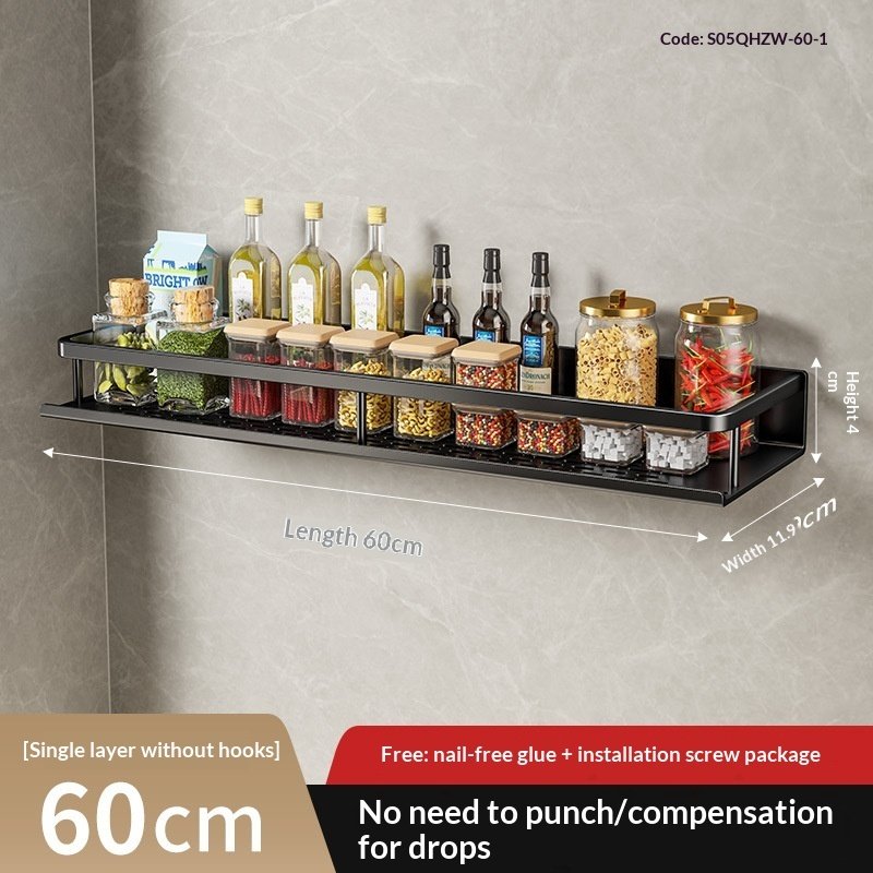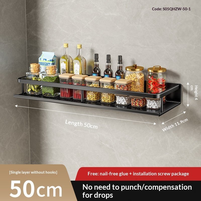 A wall-mounted kitchen storage rack designed for organizing seasonings and daily kitchen essentials.